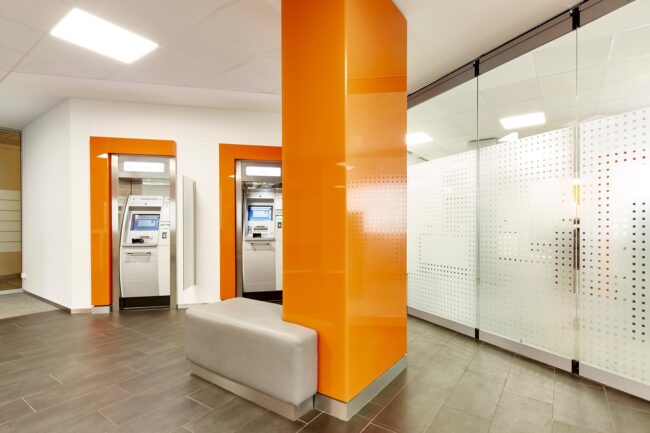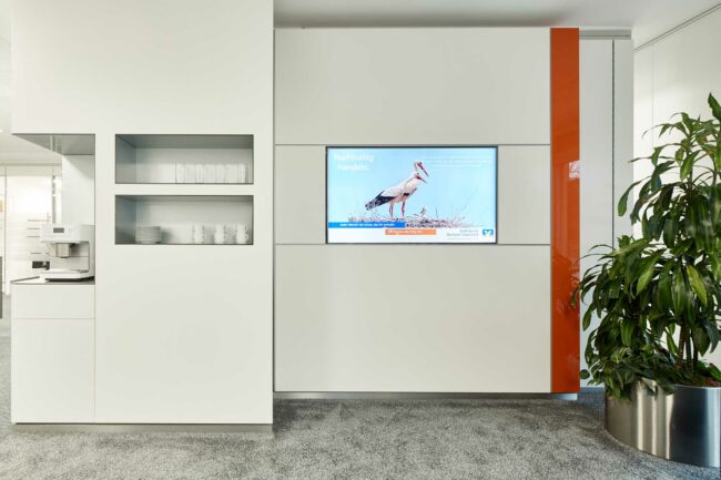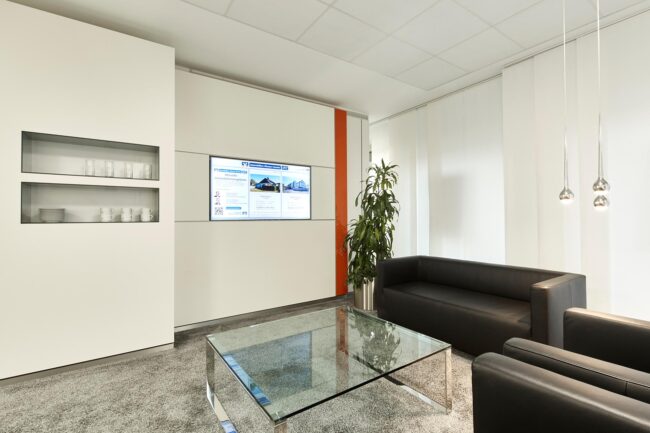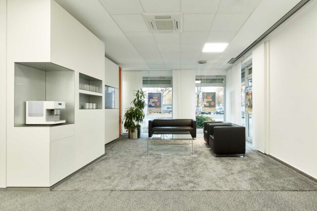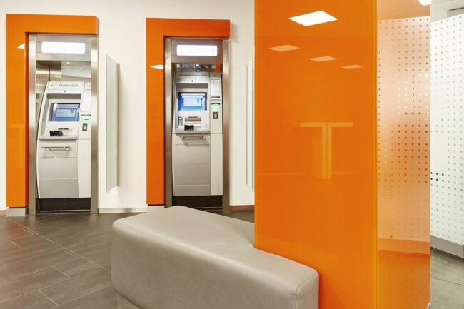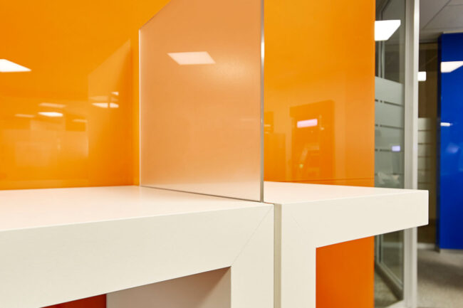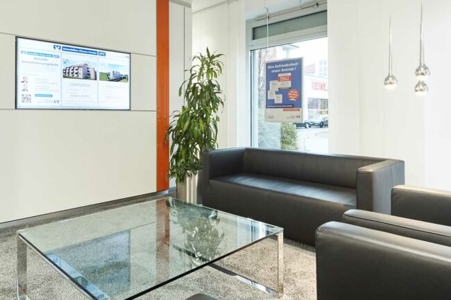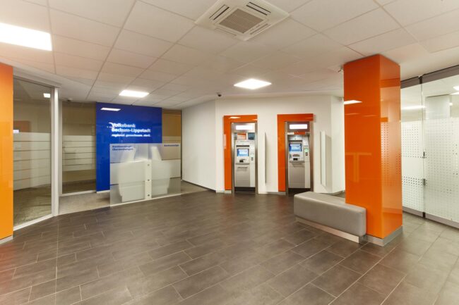 Die Geschäftsstelle in Bad Waldliesborn ist die erste Filiale, die wir für die VB Beckum-Lippstadt eG umgestalteten. In Zusammenarbeit mit einem Einrichter für Banken war die Zielvorstellung, der Geschäftsstelle eine neue, zeitgemäße Ausrichtung zu geben. Der Eingangsbereich erhielt ein frisches, farbiges Erscheinungsbild mit den CI-Farben der VB, blau und orange. Die hier entwickelten Elemente wurden auch bei den Umbaumaßnahmen der folgenden Geschäftsstellen eingesetzt. Der Empfangsbereich in Bad Waldliesborn wurde mit einer modernen Kaffeestation und einem eleganten, geradlinigen Wartebereich aufgewertet und signalisiert die Wertschätzung der Bank im Umgang mit ihren Kunden.